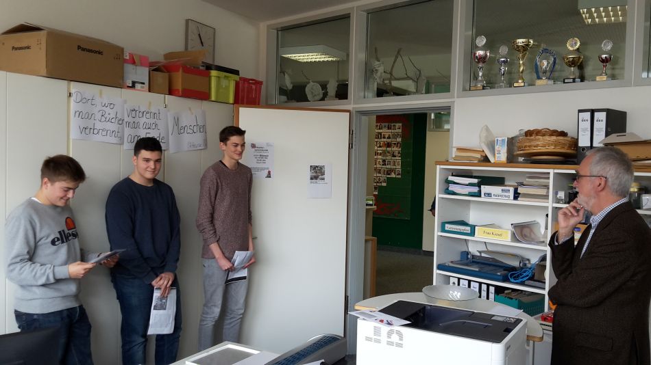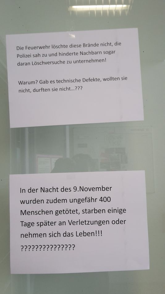 Über diese Aktion hinaus hatten sich die Deutschlehrer Dirk Albrecht, Barbara und Konrad Fischer mit ihren vierstündigen Deutschkursen vorbereitet, um alle Schülerinnen und Schüler des GEG im Laufe der dritten und vierten Stunde auch direkt im Unterricht anzusprechen. Die Gruppe hatte sich im Vorfeld des Gedenktages mit der Reichspogromnacht auseinandergesetzt und beschlossen, die Mitschüler auf eine sehr eindrückliche Weise über die konkreten Gefahren und die persönlichen Auswirkungen der Nazidiktatur zu informieren, deren Ausgangspunkt die Ereignisse der Reichspogromnacht bildeten.