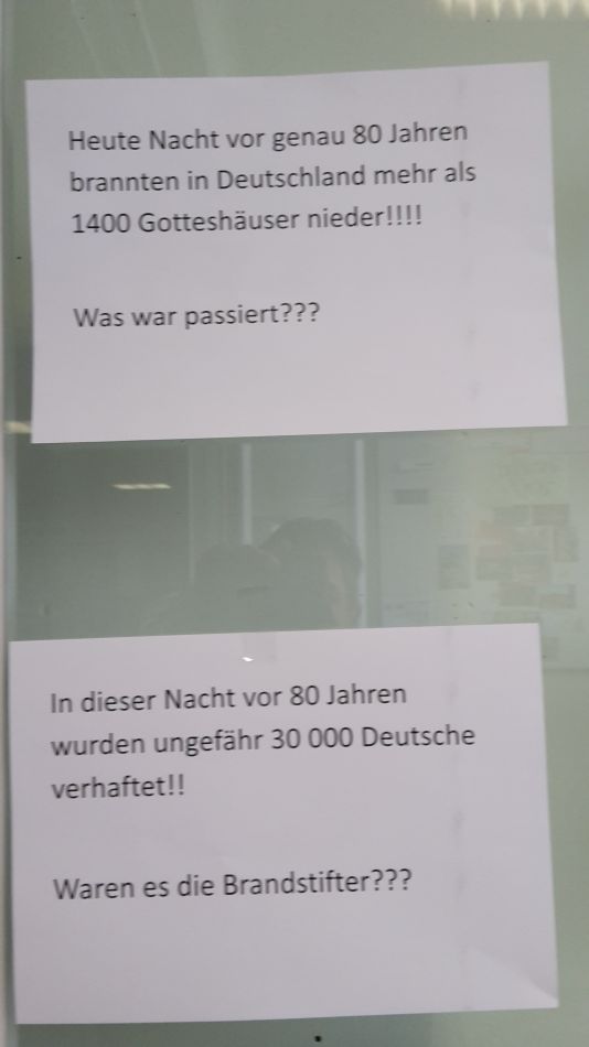 Wer am Freitagmorgen das GEG betrat wurde unweigerlich auf unterschiedliche Plakate aufmerksam, die an allen Eingängen der Schule aufgehängt worden waren: „Heute vor 80 Jahren brannten in Deutschland 1400 Gotteshäuser – Die Feuerwehr löschte aber nicht. Warum?“ oder auch „30 000 Deutsche wurden an diesem Tag verhaftet – Waren es die Brandstifter?“. Diese und andere Aussagen sollten die Schülerinnen und Schüler in eine fragende Grundstimmung versetzen. Einige konnten natürlich schon Bezüge herstellen, andere, insbesondere die jüngeren Schüler, blieben erst einmal rätselnd zurück. Das jeweils letzte der angebrachten Plakate verwies dann schließlich auf den Lichthof. Dort war eine Informationswand aufgebaut worden, auf der die grundlegenden Fakten zur Reichspogromnacht, Berichte und Bilder über diverse Attacken auf Synagogen der Region und die berühmte Rede Richard von Weizäckers zum Kriegsende präsentiert wurden. Umrahmt war dieser Ort der Information mit einem weiß gedeckten Tisch, auf dem lediglich ein Strauß wilder Rosen und eine brennende Kerze standen. Diesen Teil des Gedenktages hatten Wolfgang Scherer und Michael Jaesrich zusammen mit Neuntklässlern entworfen und den ganzen Tag über konnte man beobachten wie gut diese Form des Erinnerns angenommen wurde. Immer wieder sammelten sich kleine Gruppen von Schüler oder Lehrern vor dem Tisch, innehaltend vor den verstörenden Bildern oder vertieft in die Lektüre der dargebotenen Texte.