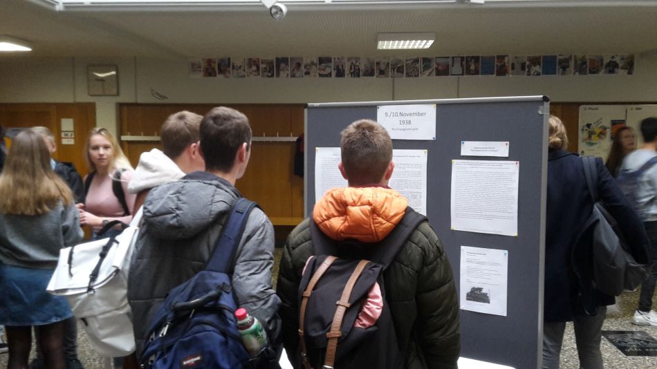 Über diese Aktion hinaus hatten sich die Deutschlehrer Dirk Albrecht, Barbara und Konrad Fischer mit ihren vierstündigen Deutschkursen vorbereitet, um alle Schülerinnen und Schüler des GEG im Laufe der dritten und vierten Stunde auch direkt im Unterricht anzusprechen. Die Gruppe hatte sich im Vorfeld des Gedenktages mit der Reichspogromnacht auseinandergesetzt und beschlossen, die Mitschüler auf eine sehr eindrückliche Weise über die konkreten Gefahren und die persönlichen Auswirkungen der Nazidiktatur zu informieren, deren Ausgangspunkt die Ereignisse der Reichspogromnacht bildeten.